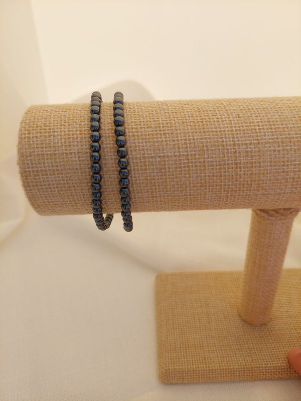 Bracelet en Hématite Diamètre des perles : 4 mm Tour de poignet : 18 cm L'Hematite est une pierre d'ancrage et permet de retrouver son calme. Elle aide à la communication et à la concentration. L'hématite apporte confiance en soi et atténue la timidité PURIFICATION : Encens RECHARGEMENT : Soleil
