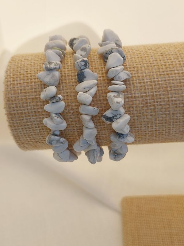 Bracelet baroque en howlite Tour de poignet 17-18 cm L'Howlite est une pierre de sagesse et de réconfort. Elle permet de fluidifier les émotions et les sentiments. L'Howlite favorise la communication calme, la mémoire et l'action. Elle aide surmonter le stress et la colère. PURIFICATION : Encens ou eau RECHARGEMENT : Soleil
