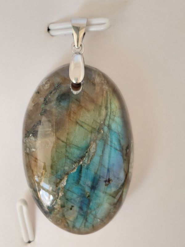 Pendentif ovale en Labradorite Bélière en argent 925 Dimension 2 cm x 3 cm La Labradorite est une pierre de protection puissante qui absorbe les énergies négatives. Elle bannit les peurs et les insécurités. Elle favorise l'imagination et l'intuition. La Labradorite aide au développement de l'ouverture d'esprit et aide à l'endormissement. Purification : Fumigation ou Eau Rechargement : Soleil ou