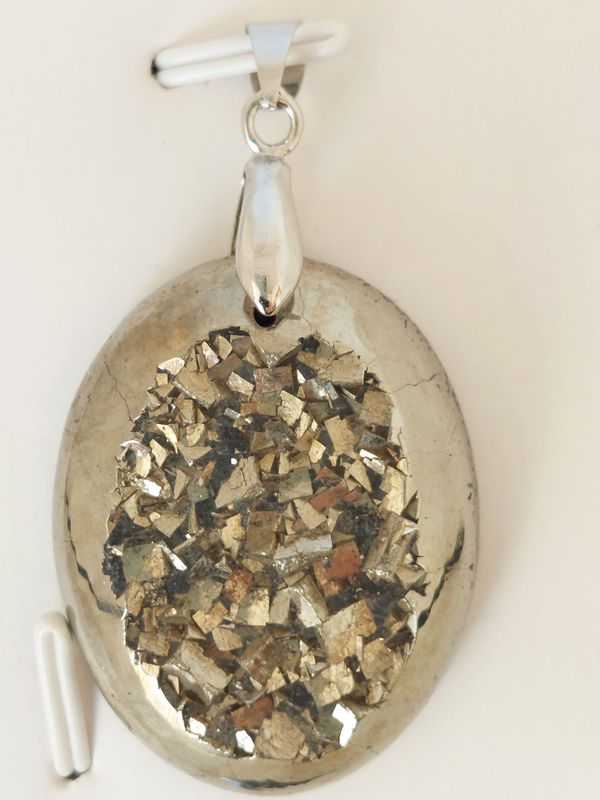Pendentif ovale en Pyrite Bélière en métal argenté Dimension : 3 cm x 2.5 cm La Pyrite symbolise le sens de l'organisation. Elle intervient sur la confiance en soi et aide à concrétiser ses projets. La Pyrite stimule la mémoire, développe les capacités créatives et dynamise l'esprit. La Pyrite est également appelé l'Or des Fous. Purification : Fumigation ou Eau Rechargement : Soleil
